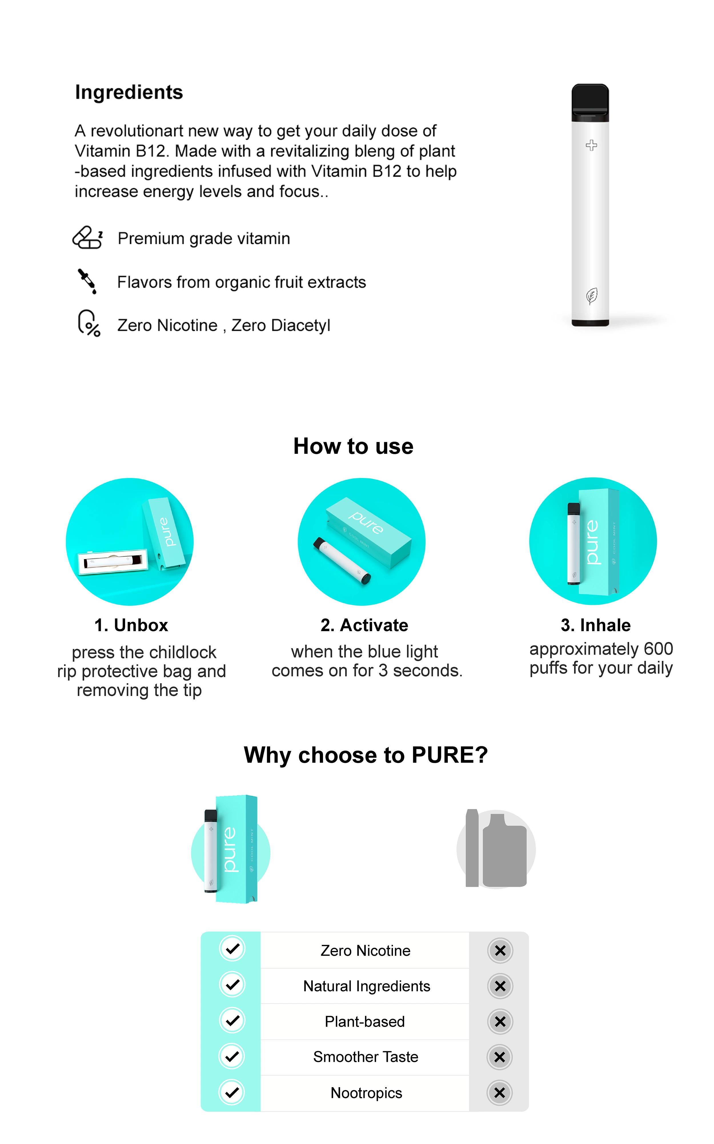 Need a breath of fresh energy? Meet your new go-to for clean, conscious vitality — the pure diffuser that’s changing the game. No smoke, no guilt, just a crisp wave of cool mint with a powerful punch of vitamin B12 in every puff.